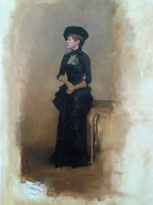 "La Femme aux gans" after Giron, o/t, Paris, 2011, R$ 27900,00 (94x75cm com moldura). Obra realizada no interior do Musée des Beaux-Arts de la Ville de Paris, portando carimbo oficial– Petit-Palais, França